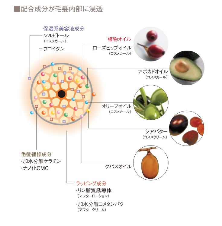 やわらかい手触りに。カールを美しく保ったり、扱いやすいテクスチャーにするために、うるおいは欠かせません。うるおいリッチ成分(植物オイル、保湿系美容液成分)と毛髪補修成分を配合し、うるおいのある、やわらかな髪に仕上げます。また、アフターのラッピング成分がうるおいを閉じ込め、仕上がりの良さをキープします。