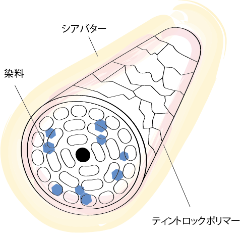 シアバターとともにキューティクルをコートし密閉するティントロックポリマーの効果※1で洗髪による毛髪内部からの染料の流出を抑えます。
