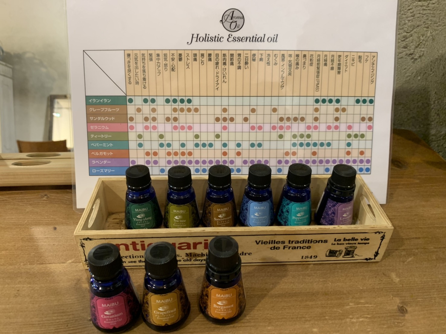 香りの種類によって体の不調に効く効能が違うので、表を見ながら実際に香りを嗅いで決める事も出来ます。